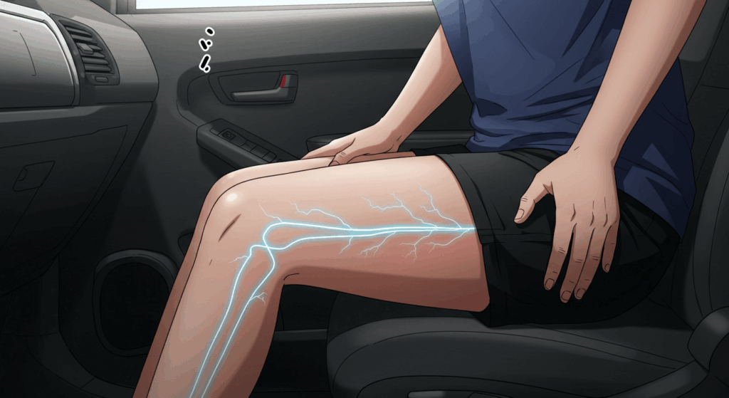 운전 시 고관절이 구부러지고 무릎은 굽힌 자세로 장시간 유지됩니다. 이로 인해 좌골신경이 이상근(Piriformis muscle) 같은 주변 근육에 의해 눌릴 수 있습니다. 이때 엉덩이에서 다리 뒤쪽으로 이어지는 방사통이 생기며, 흔히 ‘좌골신경통’으로 이어지기도 합니다.