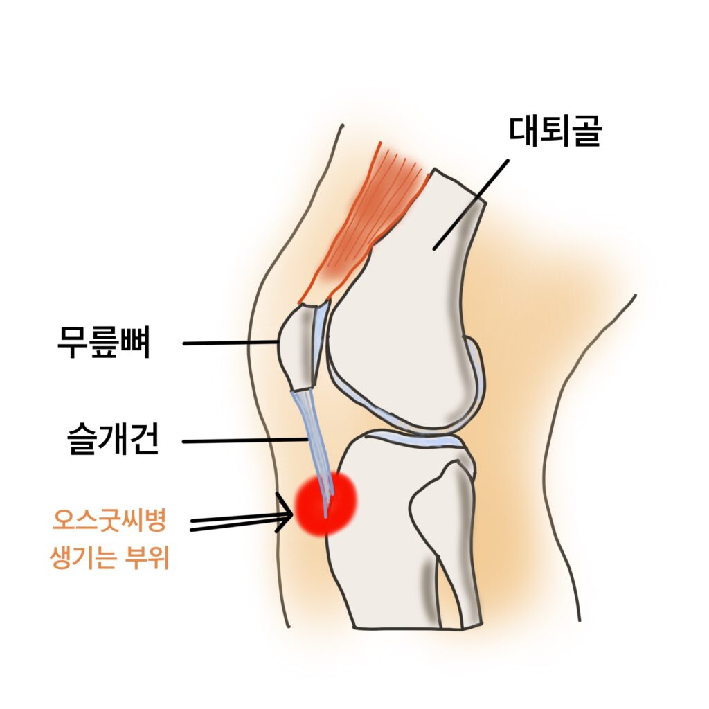 오스굿씨병(Osgood-Schlatter Disease)은 주로 성장기 청소년에게 발생하는 질환입니다. 슬개골과 경골을 연결하는 인대가 경골 전면에 부착되는 결절 부위에 염증이 생기는 것으로, 무릎 앞쪽의 정강이뼈 윗부분이 튀어나오며 통증과 부종이 발생합니다.